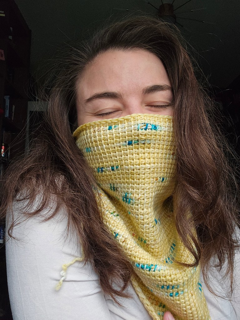 Ok so during this challeneg I have finished 2 WIPs! I finished the beautiful Sienna Triangle Shawl: I also turned the tunisian crochet experimenting in to a snood/hair snood?We aren’t really in the right weather for it but I do really like it! - May Crochet Challenge – Unknown Challenge
